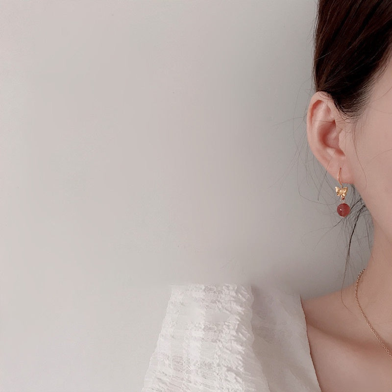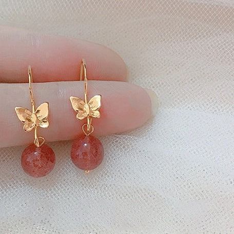 🔥現貨🔥【蝴蝶夢】天然水晶耳環新款小眾氣質蝴蝶草莓晶耳鉤耳飾"開運堂"