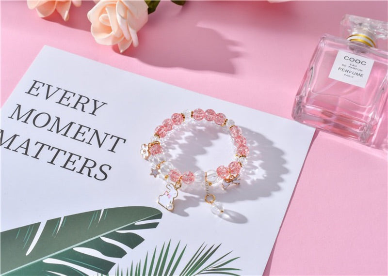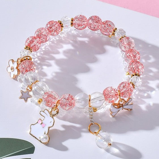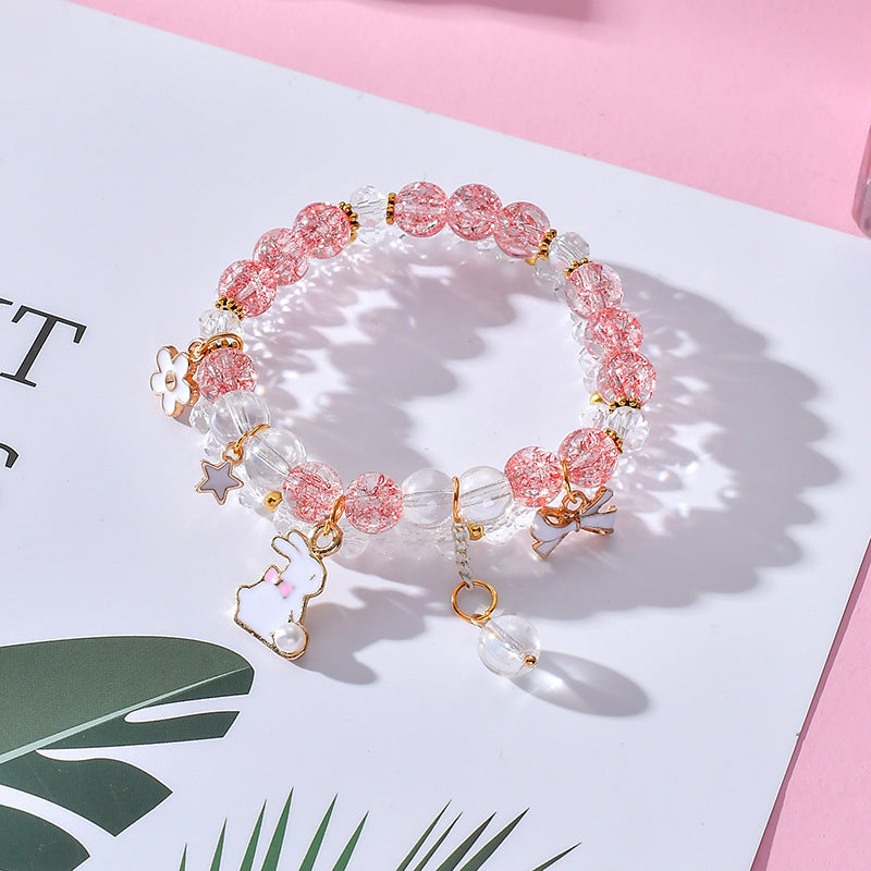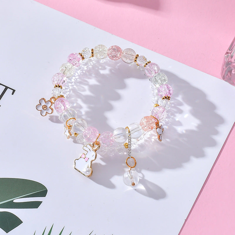 🔥現貨🔥新款爆花水晶串珠手鍊小兔子花朵可愛小清新單圈女士手串飾品【飾品批發】