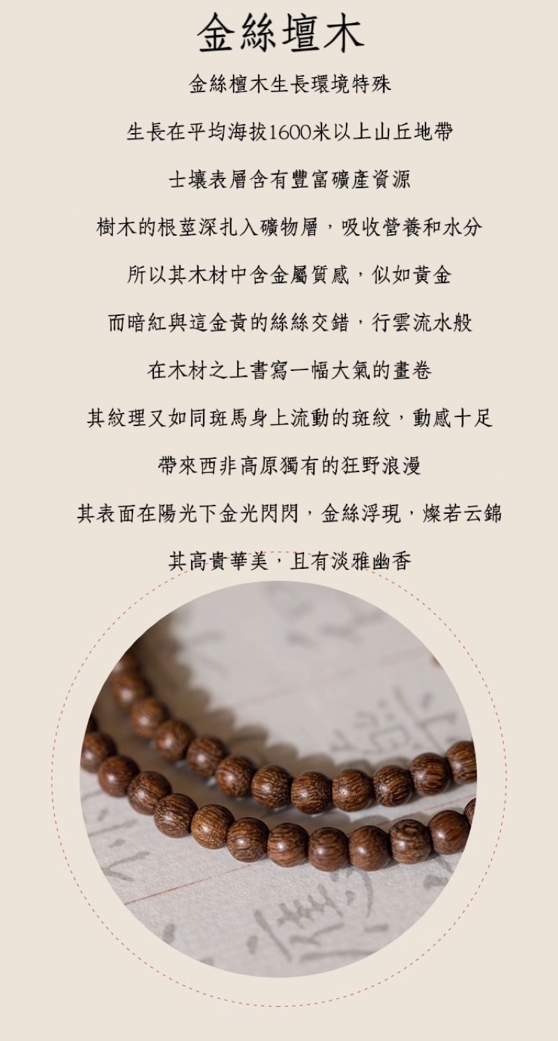 精選天然金絲檀木,質地堅實,顏色好,密度大