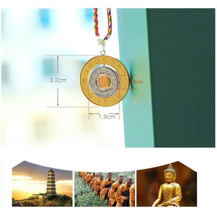 及六字真言,外圈為十二生肖及八吉祥。內圈及中圈可撥動旋轉。可化煞轉運,化