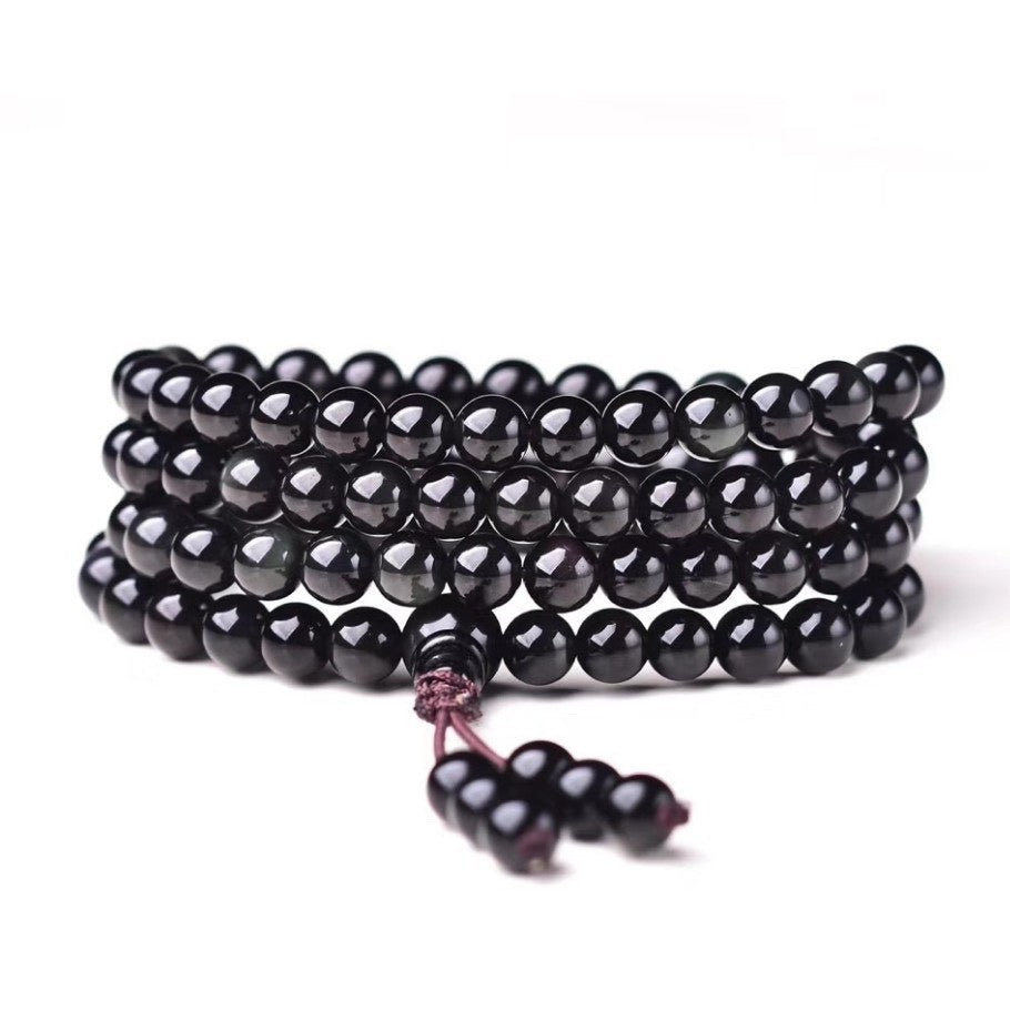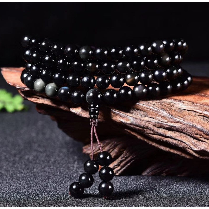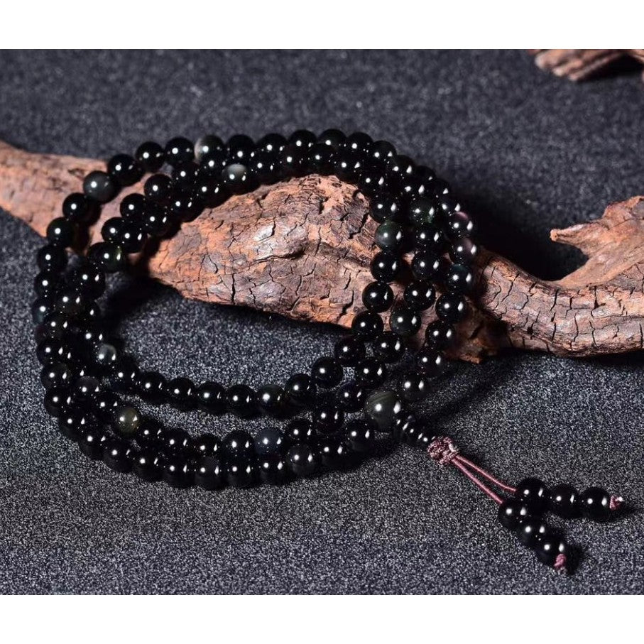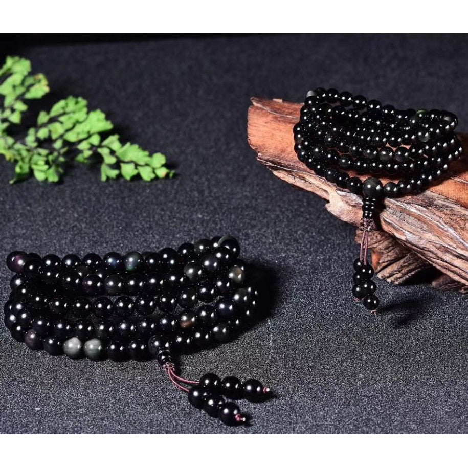 🔥現貨🔥天然黑曜石108顆佛珠手鍊彩曜石手鍊念珠四圈彩虹眼