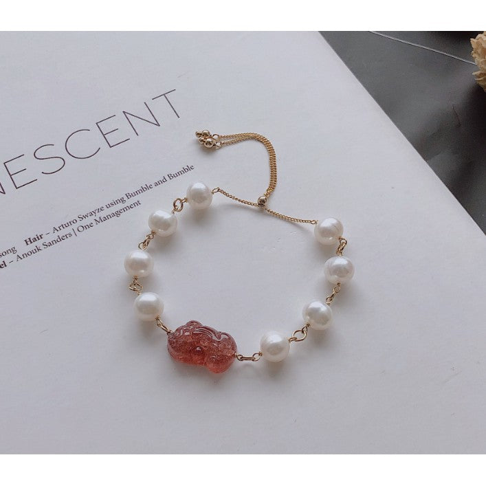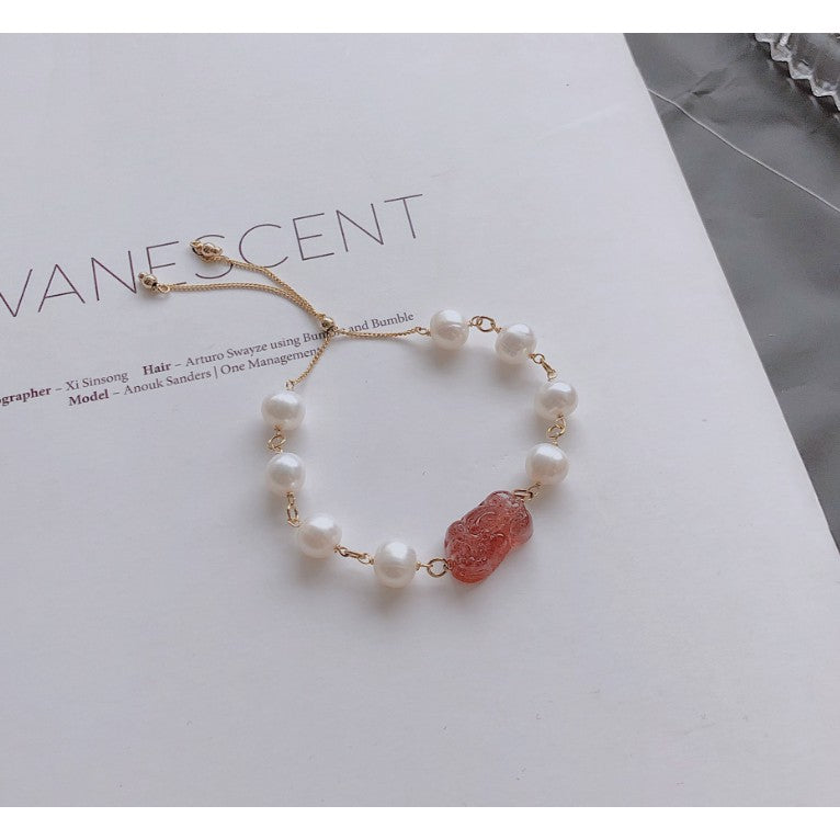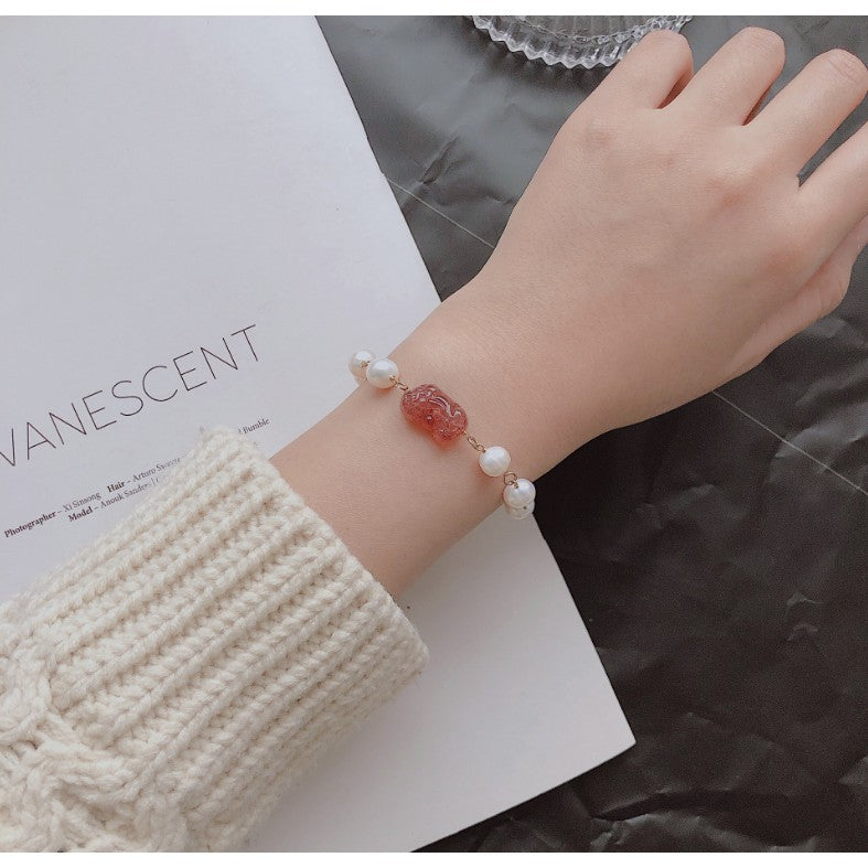 🔥現貨🔥天然珍珠手鍊女14K包金搭配草莓晶貔貅閨蜜女友生日禮物"開運堂"
