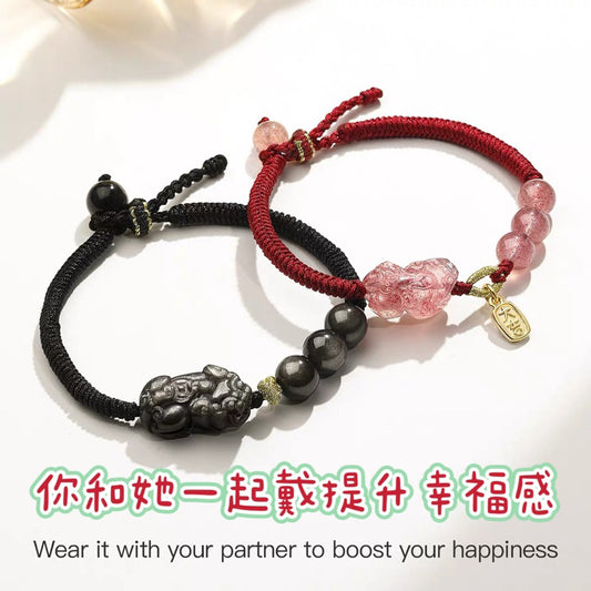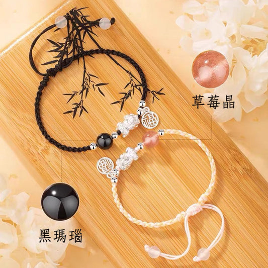 現貨 招財貔貅草莓晶銀曜石編織本命年情侶手鍊一對手繩情侶款閨蜜生日禮物情人節